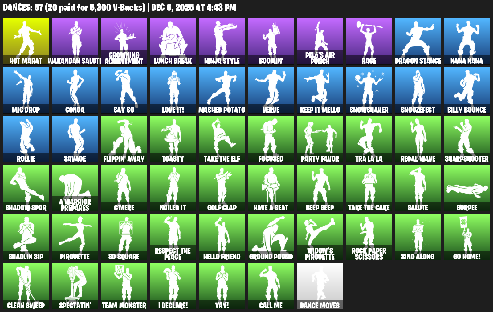 Hot Marat, Wakandan Salute, Crowning Achievement, Lunch Break, Boomin’, Pelé’s Air Punch, Rage, Dragon Stance, Nana Nana, Mic Drop, Conga, Say So, Love it!, Mashed Potato, Verve, Keep It Mello, Snowshaker, Snoozefest, Billy Bounce