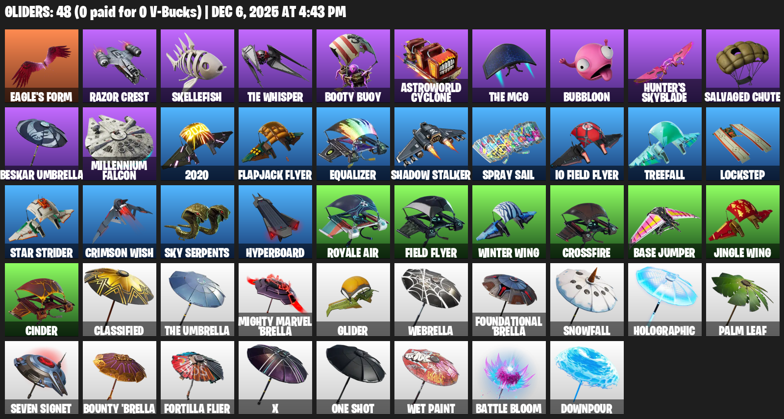 Eagle’s Form, Razor Crest, Skellefish, TIE Whisper, Booty Buoy, Astroworld Cyclone, Bubbloon, Hunter’s Skyblade, Salvaged Chute, Beskar Umbrella, Millennium Falcon, 2020, Flapjack Flyer, Equalizer, Shadow Stalker, Spray Sail, Treefall, Lockstep