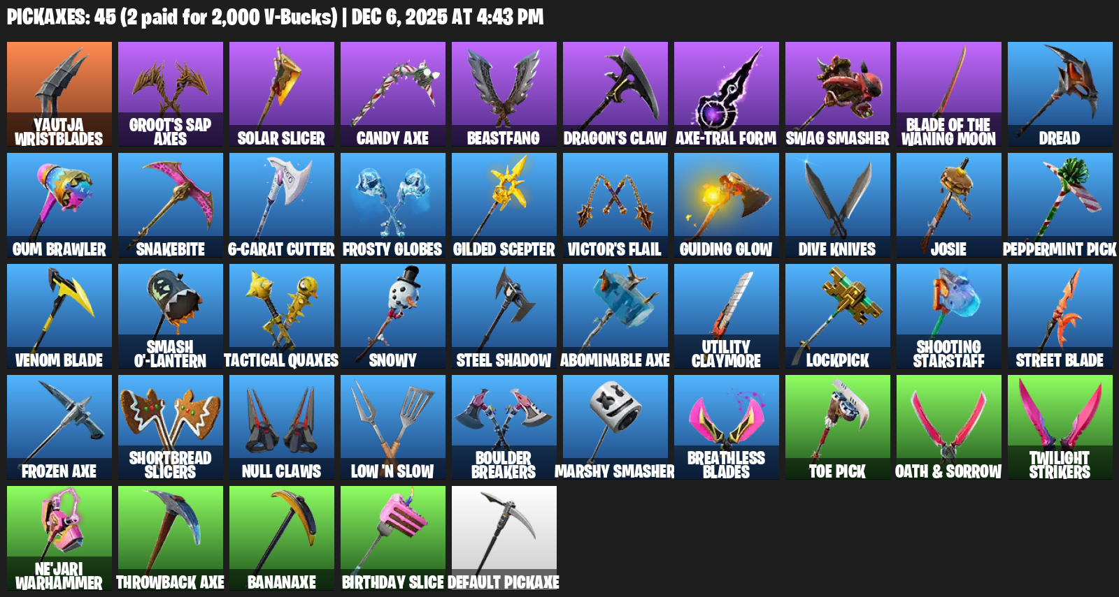 Yautja Wristblades, Groot’s Sap Axes, Solar Slicer, Candy Axe, Beastfang, Dragon’s Claw, Swag Smasher, Dread, Gum Brawler, Snakebite, 6-Carat Cutter, Frosty Globes, Gilded Scepter, Victor’s Flail, Guiding Glow, Dive Knives, Josie, Peppermint Pick
