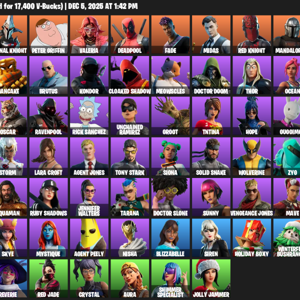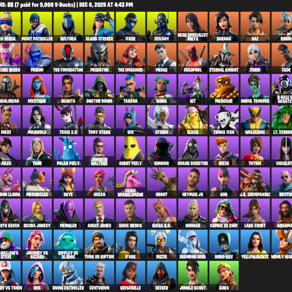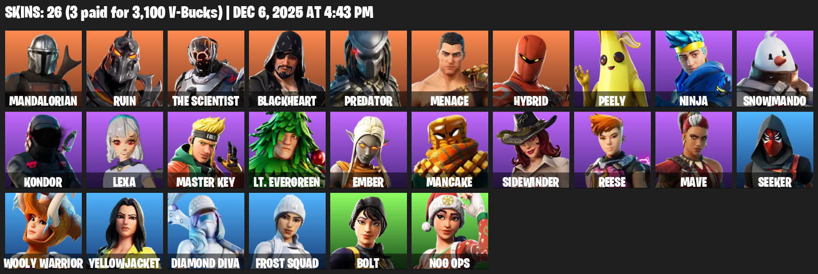 Mandalorian, Ruin, The Scientist, Blackheart, Predator, Menace, Hybrid, Peely, Ninja, Snowmando, Kondor, Lexa, Master Key, Lt. Evergreen, Ember, Mancake, Sidewinder, Reese, Mave, Seeker