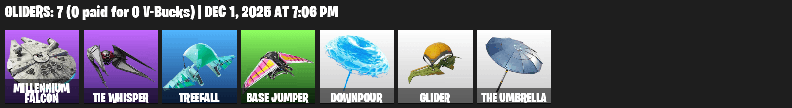 Millennium Falcon, TIE Whisper, Treefall, Base Jumper, Downpour, Glider