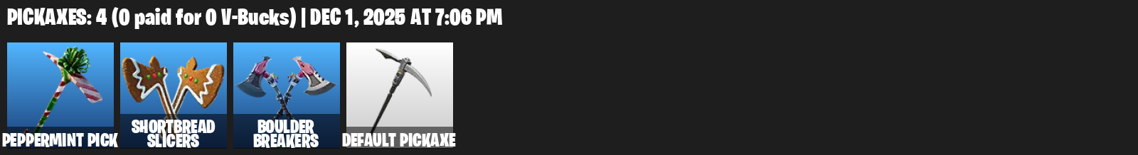 Peppermint Pick, Shortbread Slicers, Boulder Breakers, Default Pickaxe