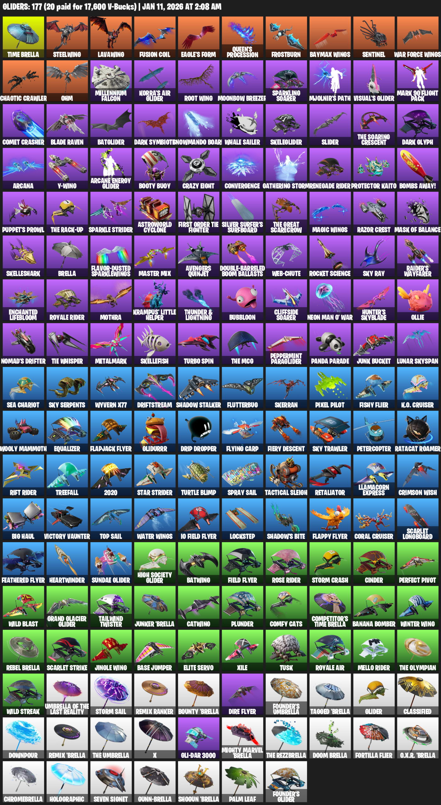 Time Brella, Steelwing, Lavawing, Eagle’s Form, Queen’s Procession, Frostburn, Baymax Wings, Chaotic Crawler, Ohm, Millennium Falcon, Korra’s Air Glider, Root Wing, Moonbow Breezer, Sparkling Soarer, Mjolnir’s Path, Mark 90 Flight Pack