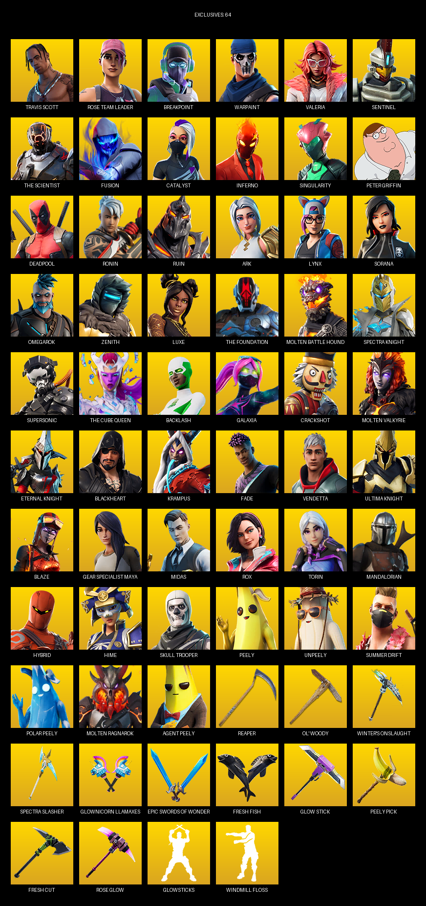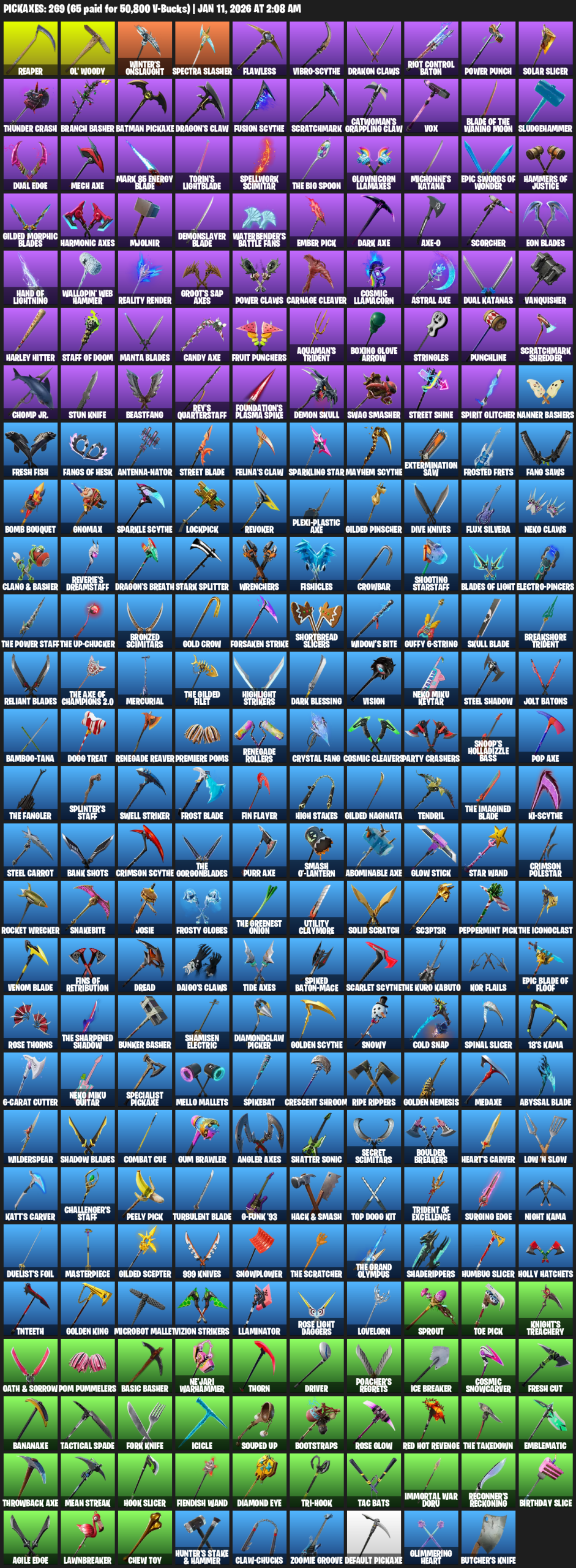 Reaper, Ol’ Woody, Winter’s Onslaught, Spectra Slasher, Flawless, Vibro-scythe, Drakon Claws, Riot Control Baton, Power Punch, Solar Slicer, Thunder Crash, Branch Basher, Batman Pickaxe, Dragon’s Claw, Scratchmark, Vox, Sludgehammer