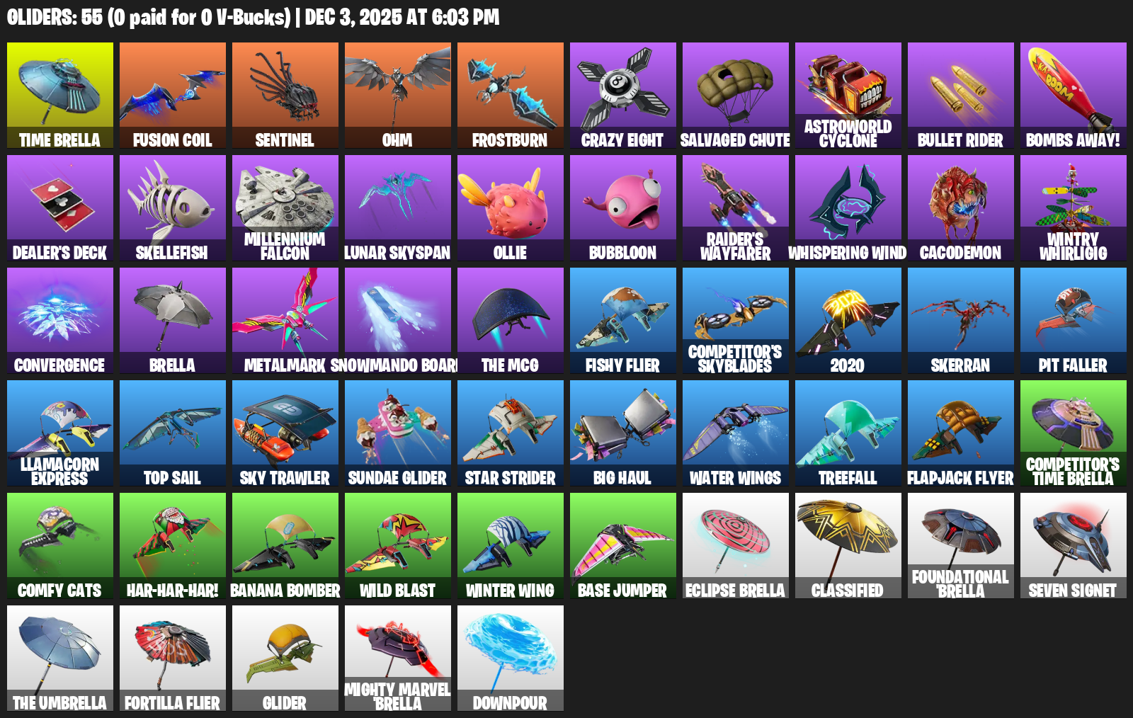 Time Brella, Sentinel, Ohm, Frostburn, Crazy Eight, Salvaged Chute, Astroworld Cyclone, Bullet Rider, Bombs Away!, Dealer’s Deck, Skellefish, Millennium Falcon, Lunar Skyspan, Ollie, Bubbloon, Raider’s Wayfarer, Whispering Wind, Cacodemon, Wintry Whirligig