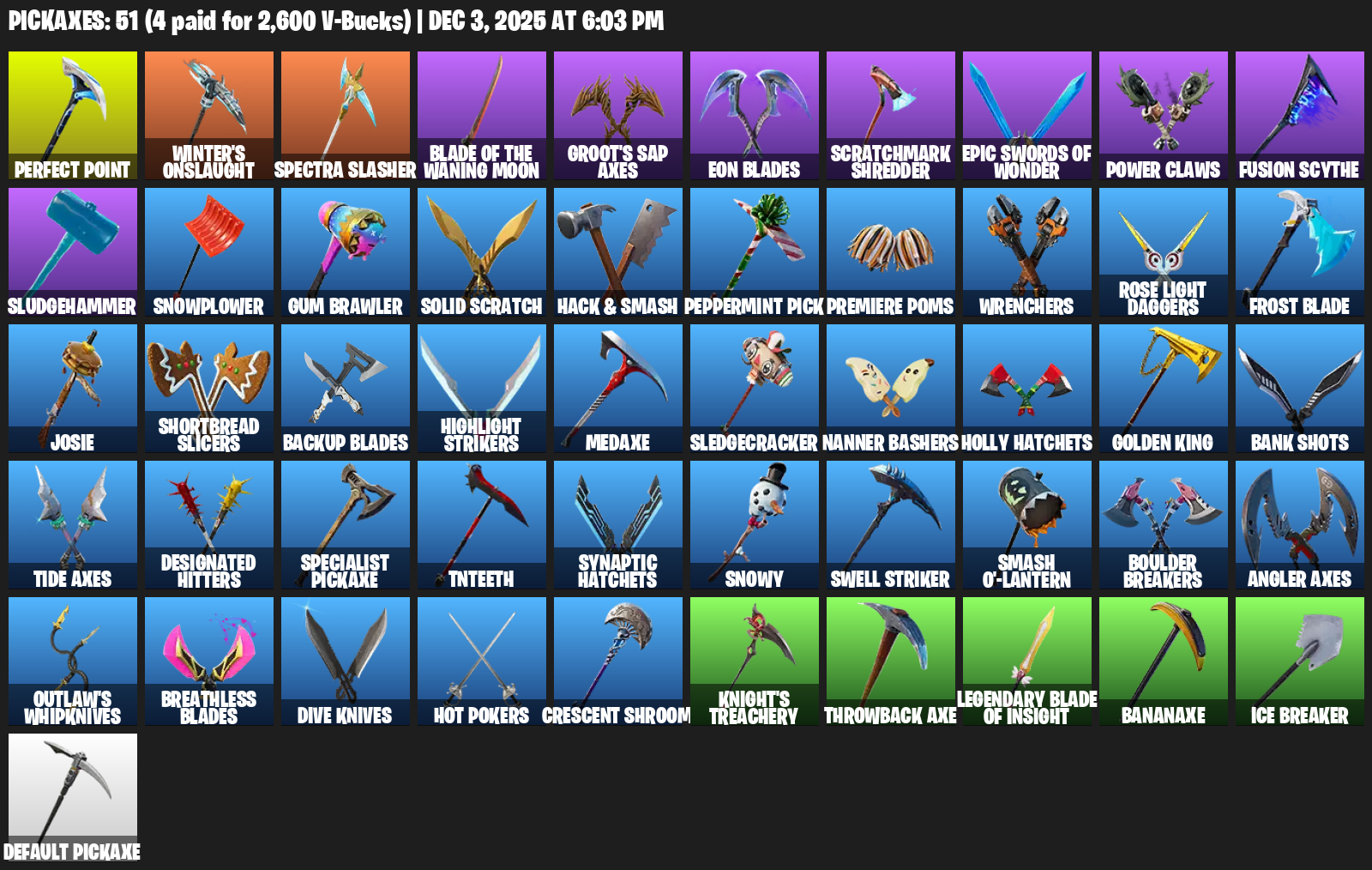 Perfect Point, Winter’s Onslaught, Blade of the Waning Moon, Groot’s Sap Axes, Eon Blades, Scratchmark Shredder, Power Claws, Sludgehammer, Snowplower, Gum Brawler, Solid Scratch, Hack & Smash, Peppermint Pick, Premiere Poms, Wrenchers, Rose Light Daggers