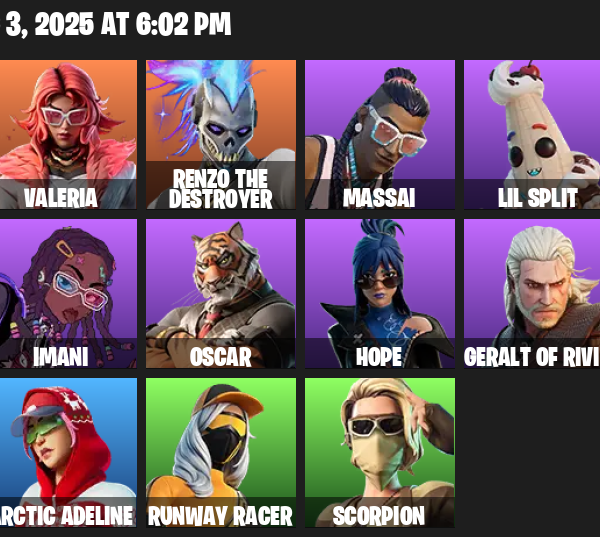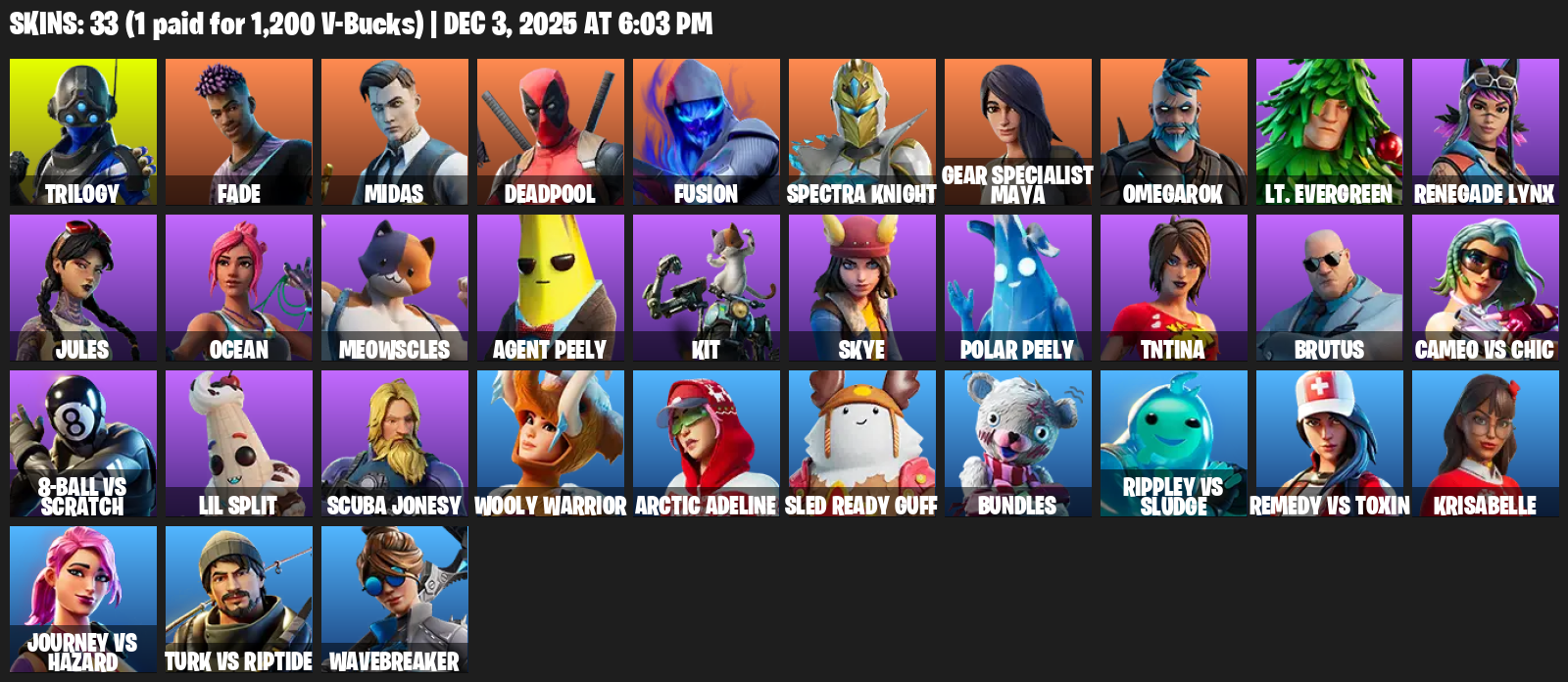 Gear Specialist Maya, Trilogy, Fade, Midas, Deadpool, Fusion, Spectra Knight, Omegarok, Lt. Evergreen, Renegade Lynx, Jules, Ocean, Meowscles, Agent Peely, Kit, Skye, TNTina, Brutus, Cameo vs Chic