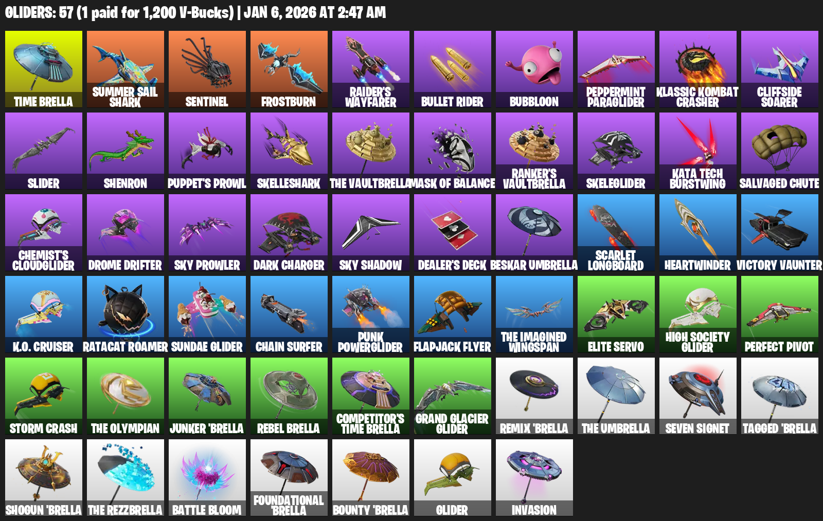 Time Brella, Summer Sail Shark, Sentinel, Frostburn, Raider’s Wayfarer, Bullet Rider, Bubbloon, Peppermint Paraglider, Klassic Kombat Crasher, Cliffside Soarer, Slider, Shenron, Puppet’s Prowl, Skelleshark, Mask of Balance, Ranker’s Vaultbrella, Skeleglider, Kata Tech Burstwing, Salvaged Chute