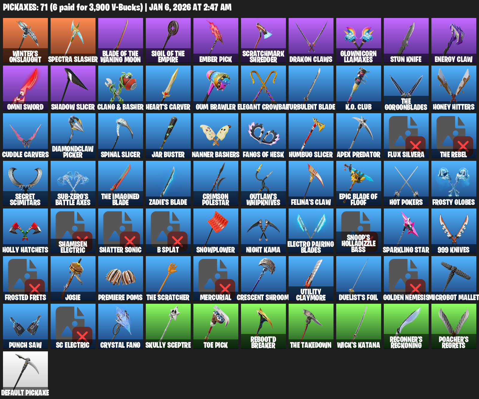 Winter’s Onslaught, Ember Pick, Scratchmark Shredder, Glownicorn Llamaxes, Stun Knife, Energy Claw, Omni Sword, Shadow Slicer, Clang & Basher, Heart’s Carver, Gum Brawler, Elegant Crowbar, Turbulent Blade, Honey Hitters