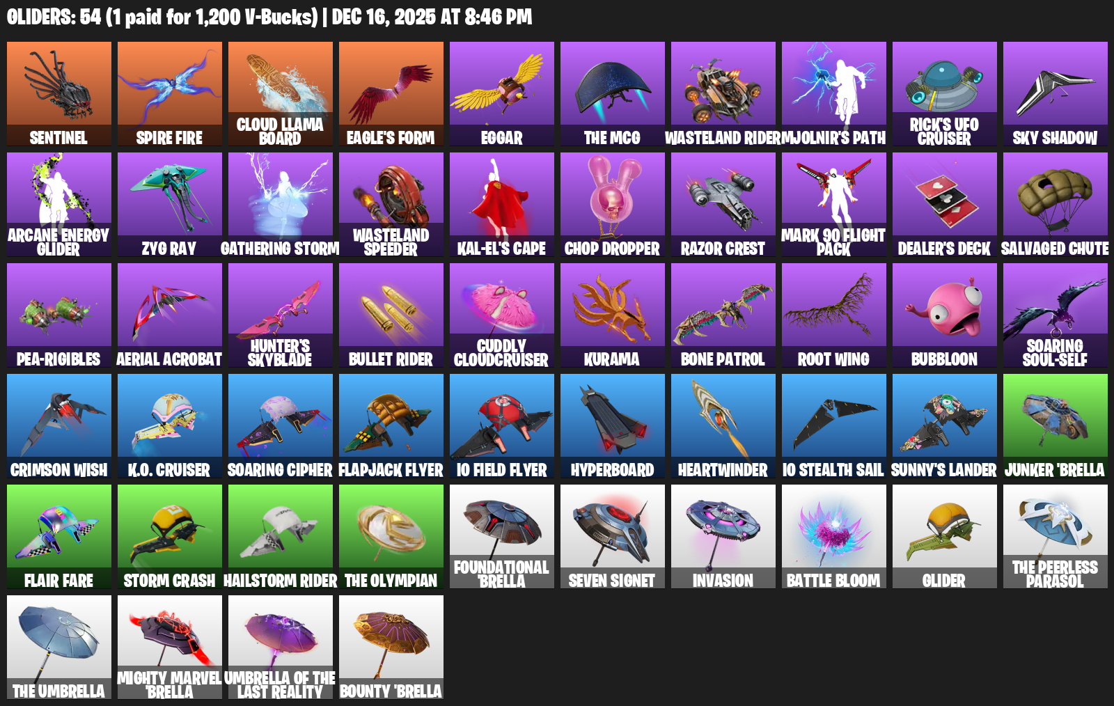 Sentinel, Cloud Llama Board, Eagle’s Form, Eggar, Wasteland Rider, Mjolnir’s Path, Rick’s UFO Cruiser, Sky Shadow, Kal-El’s Cape, Chop Dropper, Razor Crest, Dealer’s Deck, Salvaged Chute