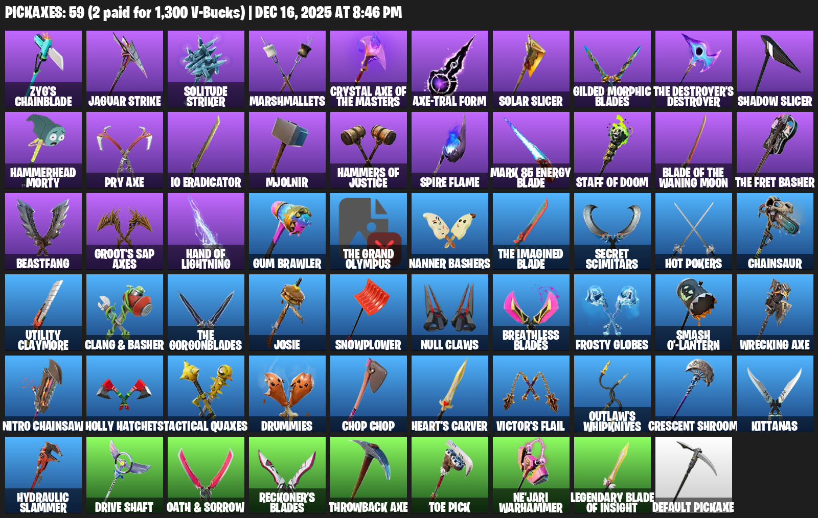 Zyg’s Chainblade, Jaguar Strike, Solitude Striker, Marshmallets, Crystal Axe of the Masters, Solar Slicer, Gilded Morphic Blades, Hammerhead Morty, IO Eradicator, Mjolnir, Mark 85 Energy Blade