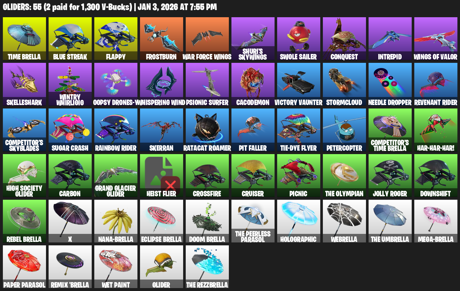 Time Brella, Flappy, Frostburn, War Force Wings, Shuri’s Skywings, Swole Sailer, Conquest, Intrepid, Skelleshark, Wintry Whirligig, Oopsy Drones-y, Whispering Wind, Psionic Surfer, Cacodemon, Victory Vaunter, Stormcloud, Needle Dropper, Revenant Rider