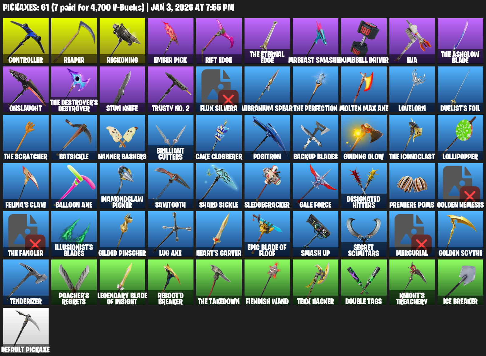 Controller, Reckoning, Ember Pick, Rift Edge, Dumbbell Driver, EVA, Onslaught, Stun Knife, Trusty No. 2, Flux Silvera, Vibranium Spear, Molten Max Axe, Lovelorn, Duelist’s Foil