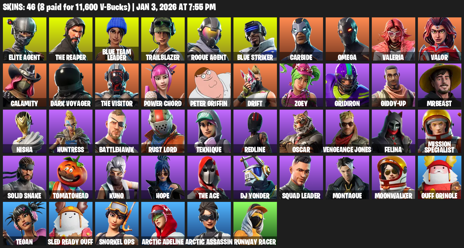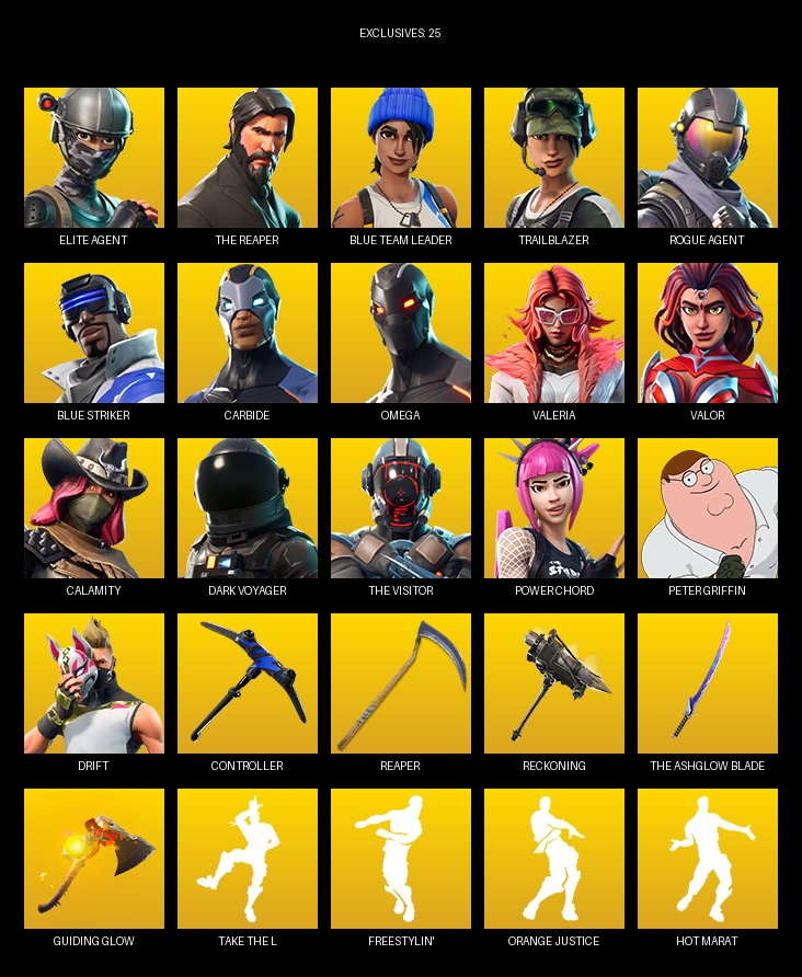 Elite Agent, The Reaper, Omega, Blue Team Leader, Trailblazer, Carbide, Valeria, Valor, Calamity, Dark Voyager, Power Chord, Peter Griffin, Drift, Zoey, Gridiron, Giddy-up, MrBeast