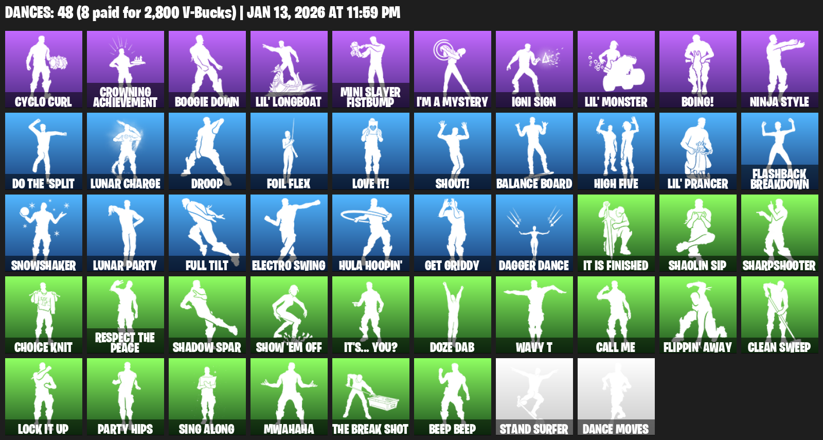 Cyclo Curl, Crowning Achievement, Boogie Down, Lil’ Longboat, Mini Slayer Fistbump, I’m a Mystery, Igni Sign, Boing!, Ninja Style, Lunar Charge, Droop, Foil Flex, Love it!, Shout!, Balance Board, High Five, Flashback Breakdown