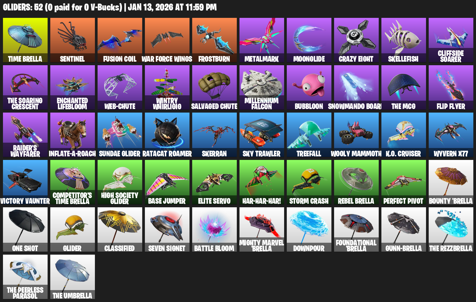 Time Brella, Sentinel, War Force Wings, Frostburn, Metalmark, Moonglide, Crazy Eight, Skellefish, Cliffside Soarer, Enchanted Lifebloom, Wintry Whirligig, Salvaged Chute, Millennium Falcon, Bubbloon, Flip Flyer