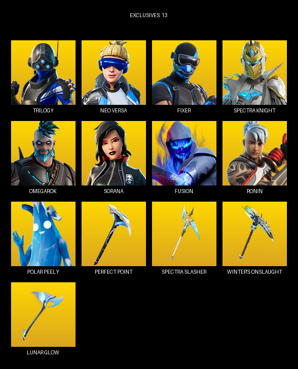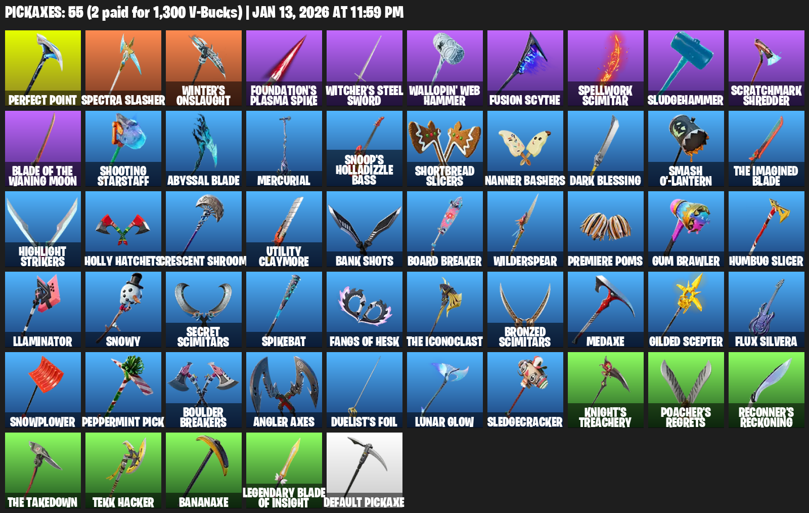 Perfect Point, Winter’s Onslaught, Foundation’s Plasma Spike, Witcher’s Steel Sword, Wallopin’ Web Hammer, Spellwork Scimitar, Sludgehammer, Scratchmark Shredder, Blade of the Waning Moon, Shooting Starstaff, Mercurial, Snoop’s Holladizzle Bass, Shortbread Slicers, Nanner Bashers, Dark Blessing, Smash O’-Lantern