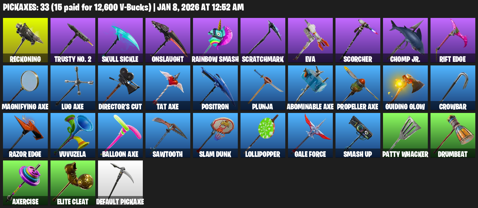 Reckoning, Trusty No. 2, Skull Sickle, Onslaught, Rainbow Smash, Scratchmark, EVA, Scorcher, Chomp Jr., Rift Edge, Magnifying Axe, Director’s Cut, Positron, Plunja, Guiding Glow, Crowbar