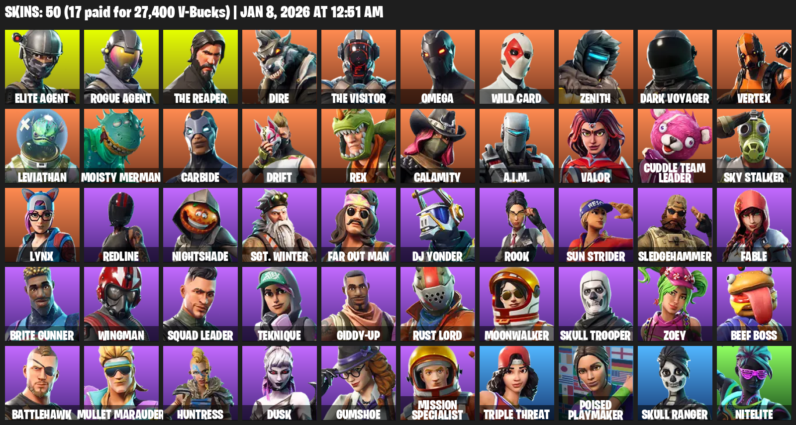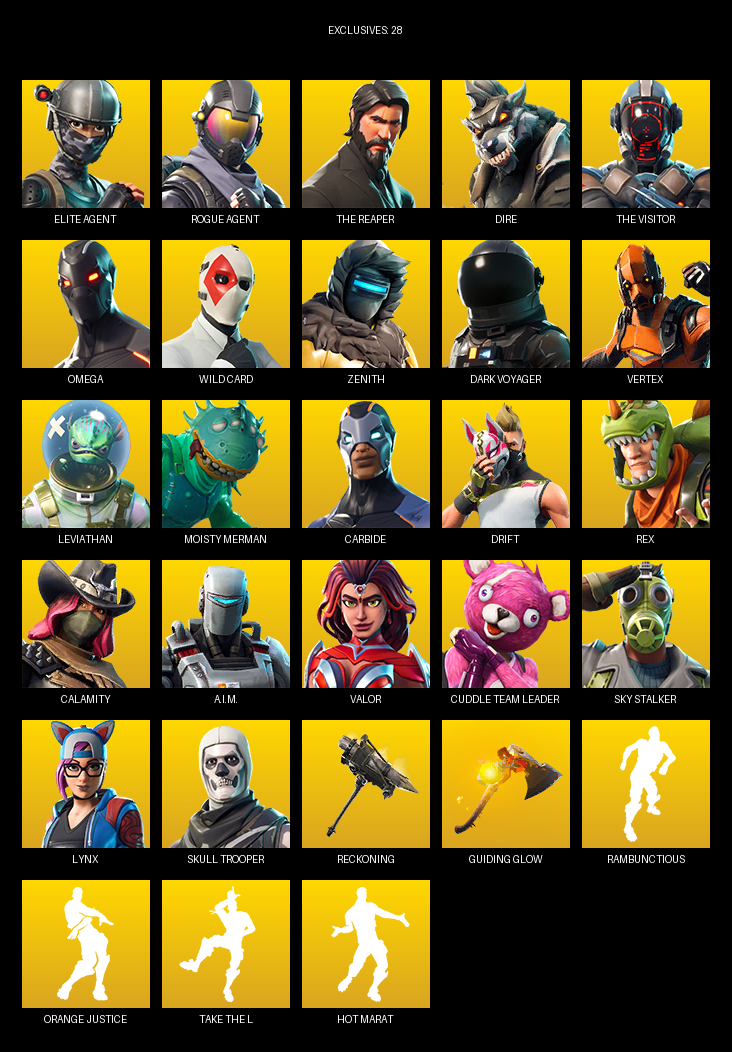 Elite Agent, The Reaper, Omega, Dire, Wild Card, Zenith, Dark Voyager, Vertex, Leviathan, Moisty Merman, Carbide, Drift, Rex, Calamity, A.I.M., Valor, Cuddle Team Leader, Sky Stalker