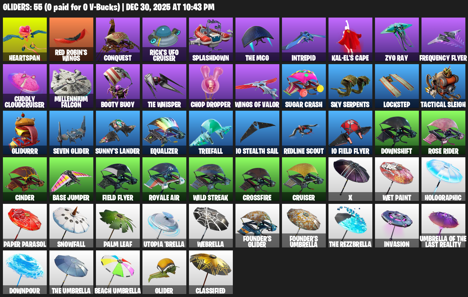 Heartspan, Red Robin’s Wings, Conquest, Rick’s UFO Cruiser, Splashdown, Intrepid, Kal-El’s Cape, Zyg Ray, Frequency Flyer, Cuddly Cloudcruiser, Millennium Falcon, Booty Buoy, TIE Whisper, Chop Dropper, Sugar Crash, Sky Serpents, Lockstep, Tactical Sleigh