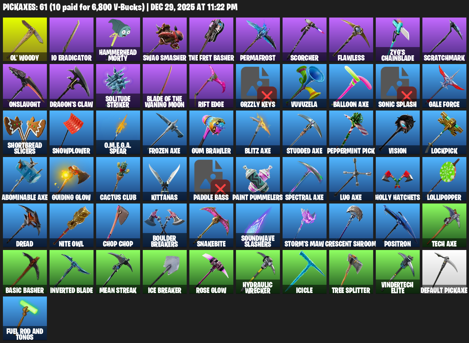 Ol’ Woody, IO Eradicator, Hammerhead Morty, Swag Smasher, Permafrost, Scorcher, Flawless, Zyg’s Chainblade, Scratchmark, Onslaught, Dragon’s Claw, Solitude Striker, Rift Edge, Grzzly Keys, Vuvuzela, Balloon Axe, Sonic Splash, Gale Force