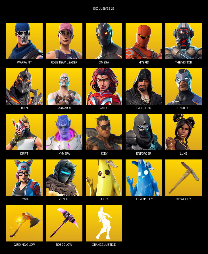 Omega, Warpaint, Rose Team Leader, Hybrid, The Visitor, Ruin, Ragnarok, Valor, Blackheart, Carbide, Drift, Kymera, Joey, Enforcer, Luxe, Lynx, Zenith, Rook, Rick Sanchez, Sidewinder