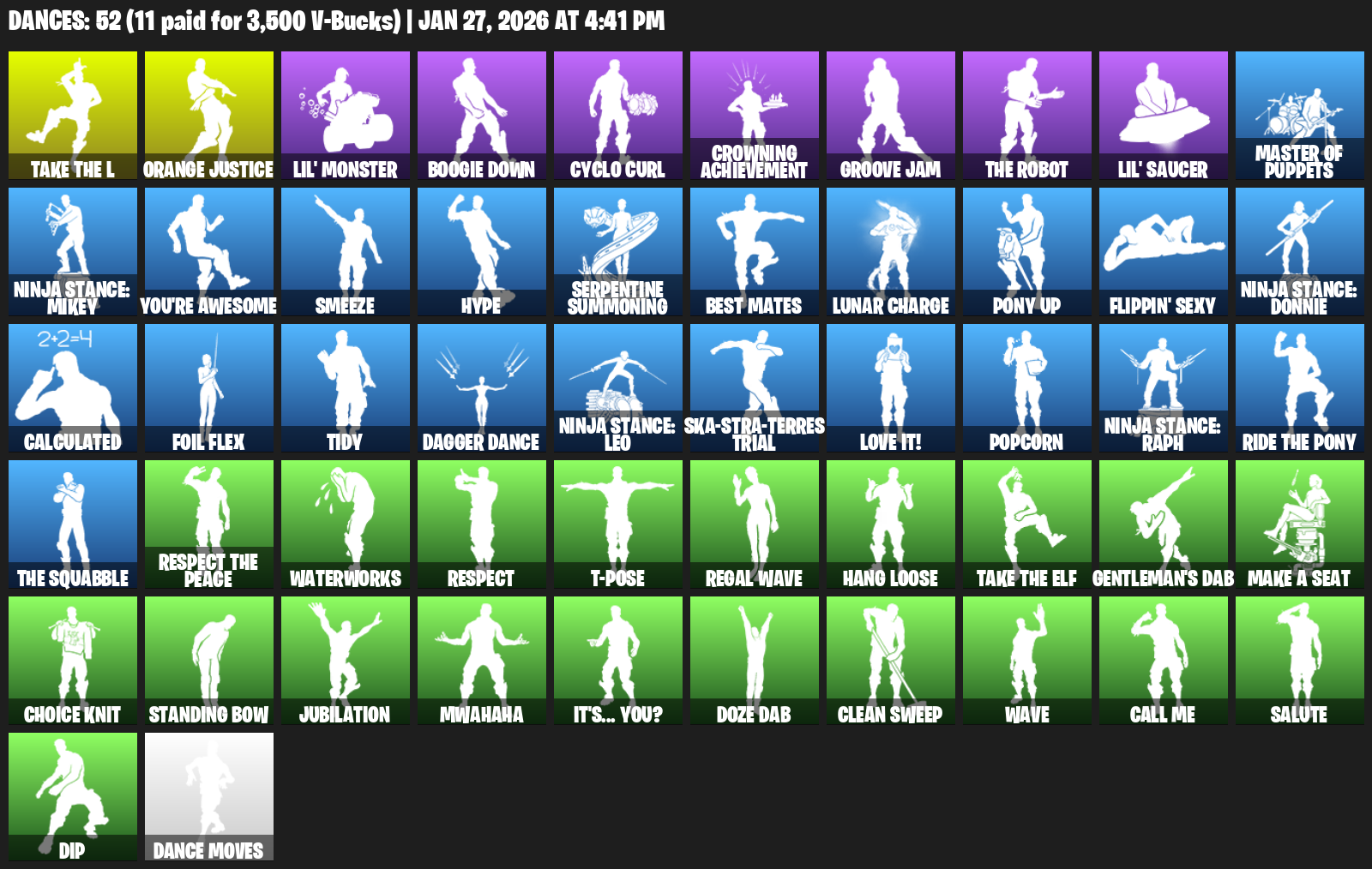 Orange Justice, Lil’ Monster, Boogie Down, Cyclo Curl, Crowning Achievement, Groove Jam, Master of Puppets, Ninja Stance: Mikey, You’re Awesome, Smeeze, Hype, Serpentine Summoning, Best Mates, Lunar Charge, Pony Up, Flippin’ Sexy