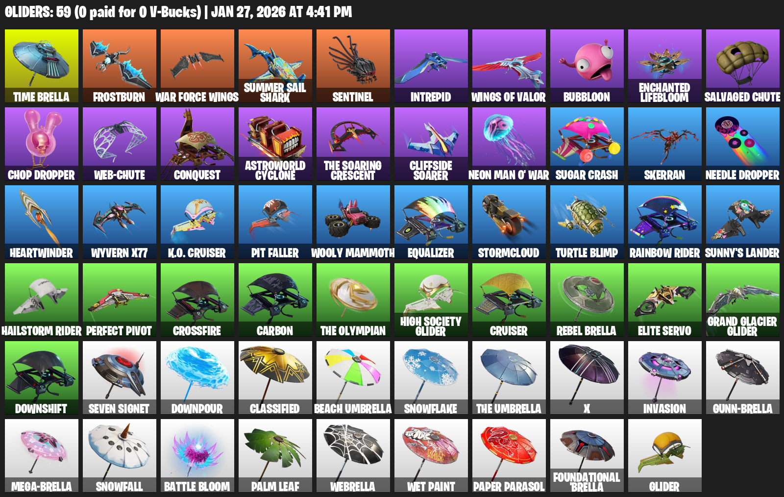 Time Brella, Frostburn, Summer Sail Shark, Sentinel, Intrepid, Bubbloon, Enchanted Lifebloom, Salvaged Chute, Chop Dropper, Conquest, Astroworld Cyclone, Cliffside Soarer, Neon Man O’ War, Sugar Crash, Skerran