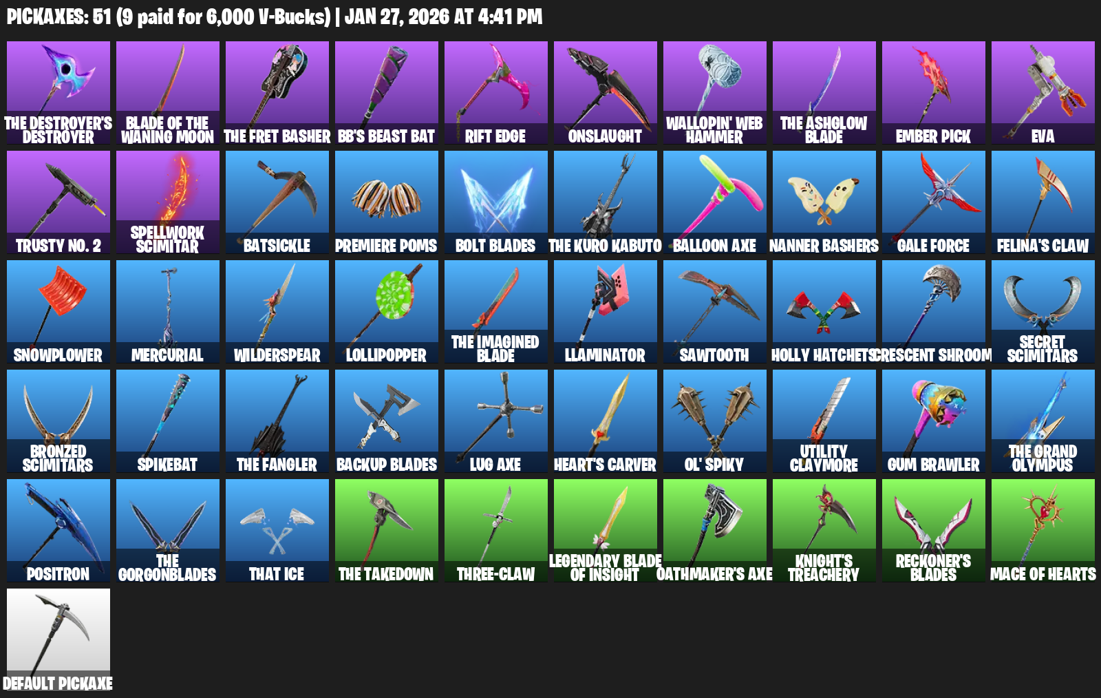 BB’s Beast Bat, Rift Edge, Onslaught, Wallopin’ Web Hammer, Ember Pick, EVA, Trusty No. 2, Spellwork Scimitar, Batsickle, Premiere Poms, Bolt Blades, Balloon Axe, Nanner Bashers, Gale Force, Felina’s Claw