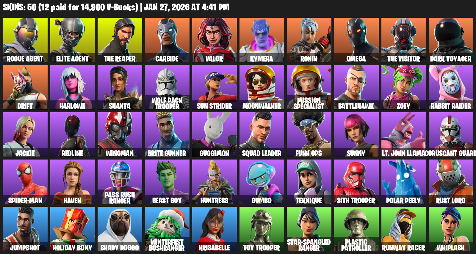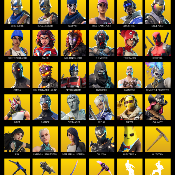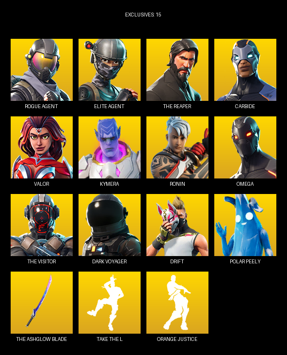 Elite Agent, The Reaper, Omega, Carbide, Valor, Kymera, Ronin, Dark Voyager, Drift, Harlowe, Shanta, Wolf Pack Trooper, Sun Strider, Moonwalker, Mission Specialist, Battlehawk, Zoey, Rabbit Raider