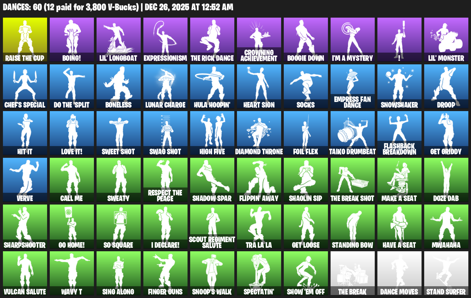 Boing!, Lil’ Longboat, Expressionism, Crowning Achievement, Boogie Down, I’m a Mystery, !, Chef’s Special, Boneless, Lunar Charge, Hula Hoopin’, Heart Sign, Socks, Empress Fan Dance, Snowshaker, Droop