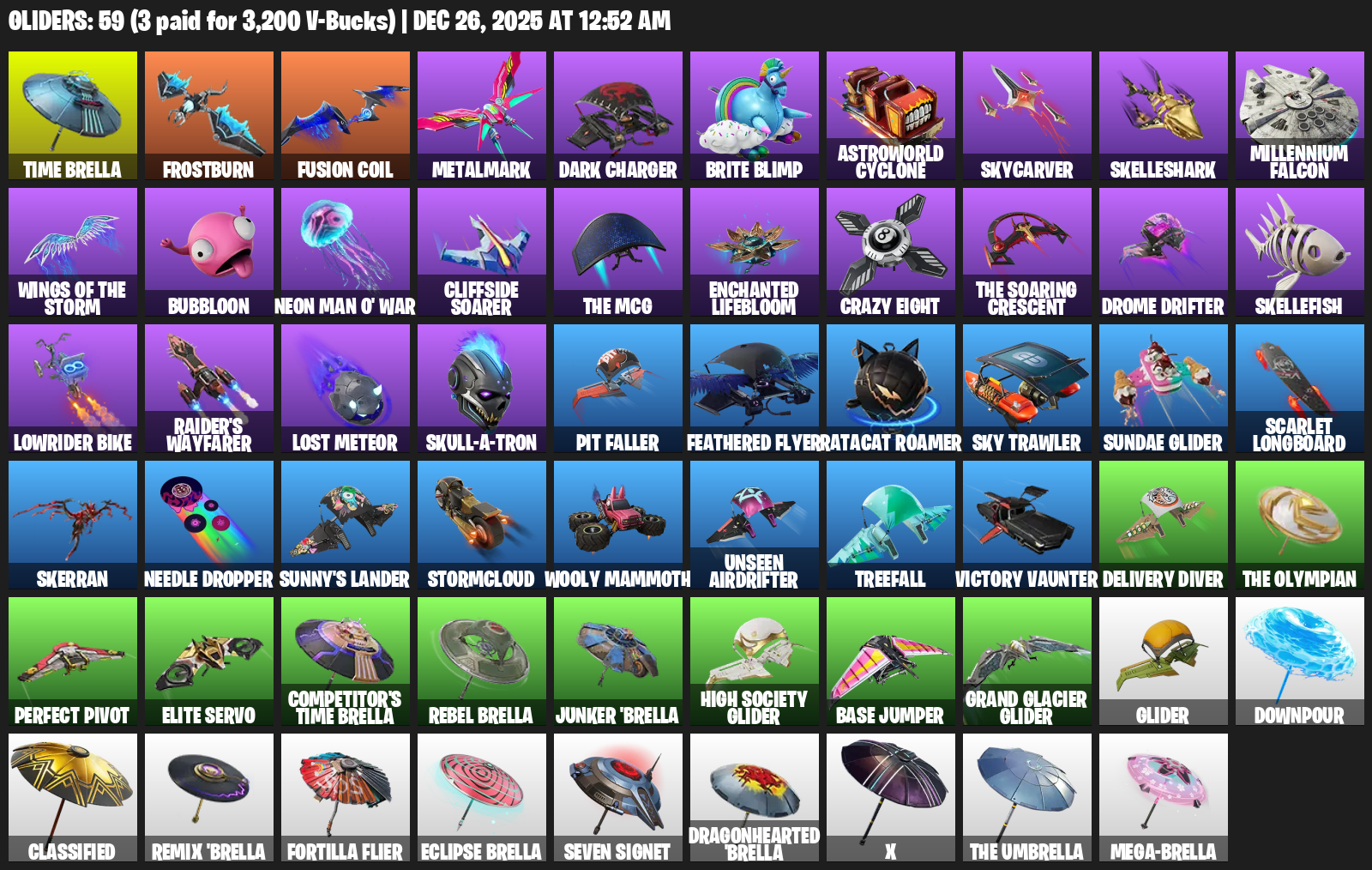 Time Brella, Frostburn, Metalmark, Brite Blimp, Astroworld Cyclone, Skycarver, Skelleshark, Millennium Falcon, Bubbloon, Neon Man O’ War, Cliffside Soarer, Enchanted Lifebloom, Crazy Eight, Drome Drifter, Skellefish