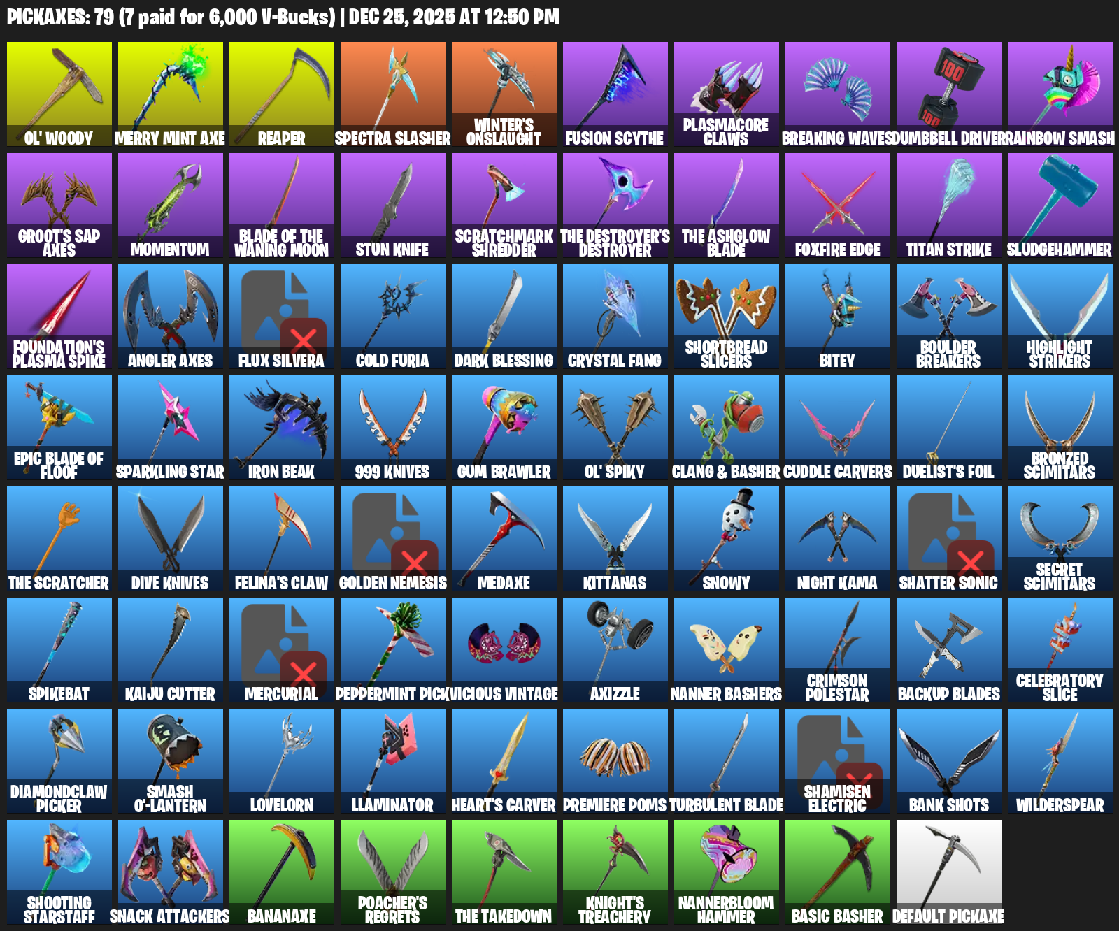 Merry Mint Axe, Ol’ Woody, Reaper, Winter’s Onslaught, Plasmacore Claws, Breaking Waves, Dumbbell Driver, Rainbow Smash, Groot’s Sap Axes, Momentum, Stun Knife, Scratchmark Shredder, Foxfire Edge, Titan Strike, Sludgehammer