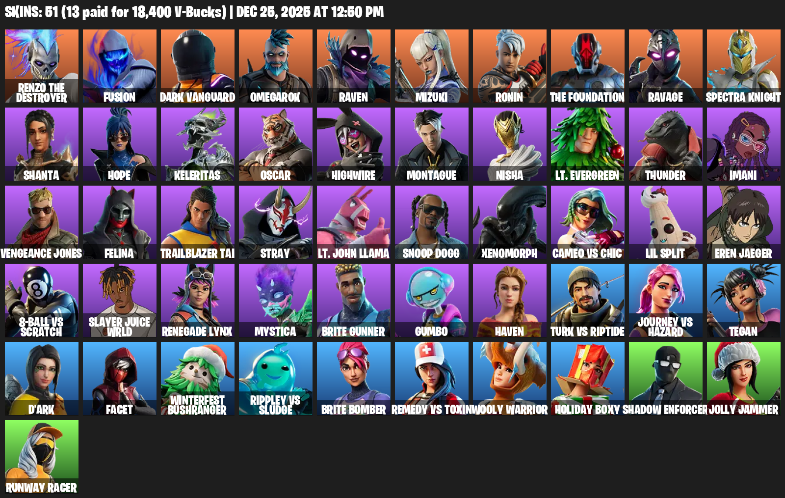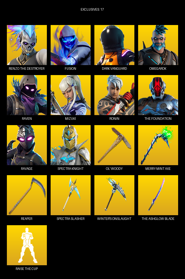 [PC/PSN/XBOX] | 51 skins | Merry Mint Axe | Reaper Axe | Renzo the Destroyer | Fusion | Dark Vanguard | Omegarok | Raven | Mizuki | Ronin | #JAD0137