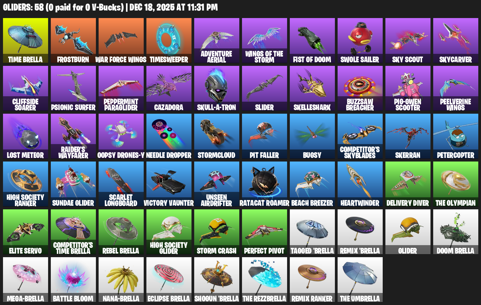 Time Brella, Frostburn, War Force Wings, Timesweeper, Adventure Aerial, Fist of Doom, Swole Sailer, Sky Scout, Skycarver, Cliffside Soarer, Psionic Surfer, Peppermint Paraglider, Cazadora, Slider, Skelleshark, Buzzsaw Breacher, Pig-Gwen Scooter