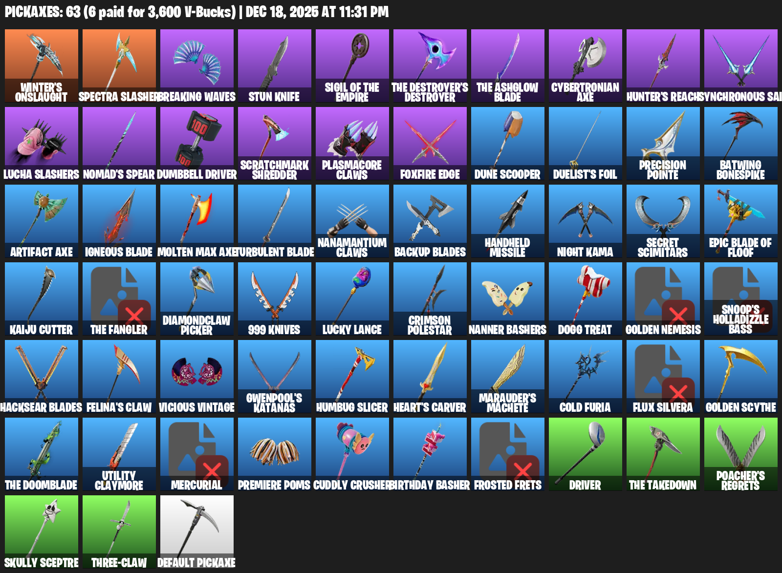 Winter’s Onslaught, Breaking Waves, Stun Knife, Cybertronian Axe, Hunter’s Reach, Synchronous Sai, Lucha Slashers, Nomad’s Spear, Dumbbell Driver, Scratchmark Shredder, Plasmacore Claws, Foxfire Edge, Dune Scooper, Duelist’s Foil, Precision Pointe, Batwing Bonespike