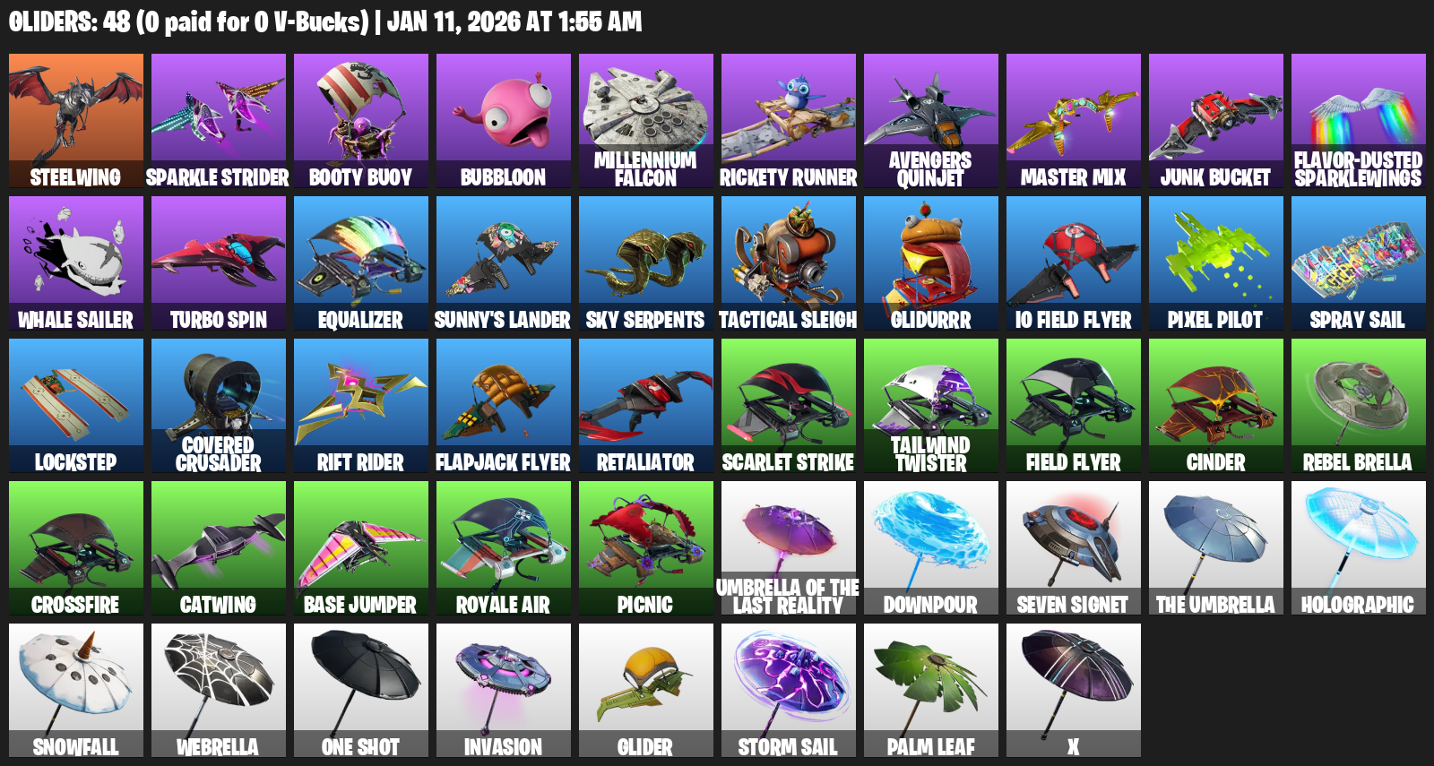 Steelwing, Sparkle Strider, Booty Buoy, Bubbloon, Millennium Falcon, Rickety Runner, Avengers Quinjet, Master Mix, Junk Bucket, Flavor-Dusted Sparklewings, Whale Sailer, Turbo Spin, Equalizer, Sunny’s Lander, Sky Serpents, Tactical Sleigh, Glidurrr, IO Field Flyer, Pixel Pilot, Spray Sail
