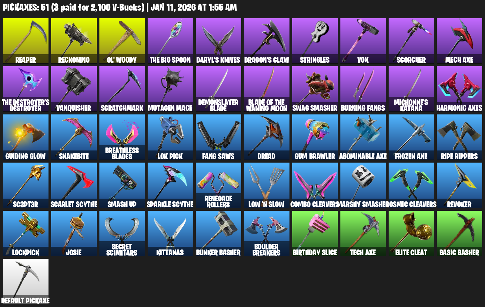 Reaper, Reckoning, Ol’ Woody, Daryl’s Knives, Dragon’s Claw, Stringles, Vox, Scorcher, Mech Axe, Vanquisher, Scratchmark, Mutagen Mace, Demonslayer Blade, Swag Smasher, Burning Fangs, Michonne’s Katana, Harmonic Axes