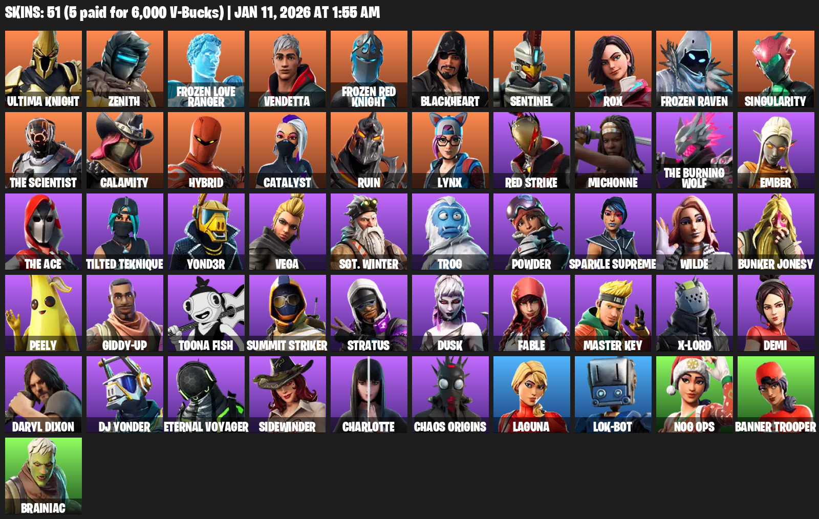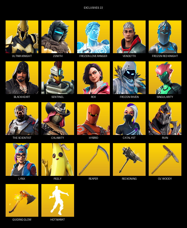 Ultima Knight, Zenith, Frozen Love Ranger, Vendetta, Blackheart, Sentinel, Rox, Singularity, The Scientist, Calamity, Hybrid, Catalyst, Ruin, Lynx, Red Strike, Michonne, Ember