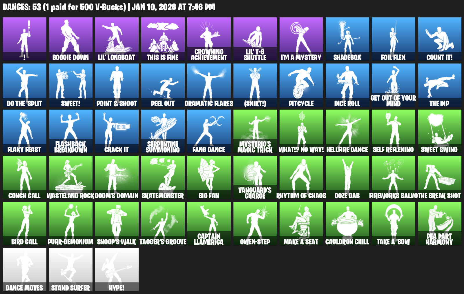 !, Boogie Down, Lil’ Longboat, This is Fine, Crowning Achievement, I’m a Mystery, Shadebox, Foil Flex, Count It!, Sweet!, Point & Shoot, Peel Out, Dramatic Flares, (Snikt!), Pitcycle, Dice Roll