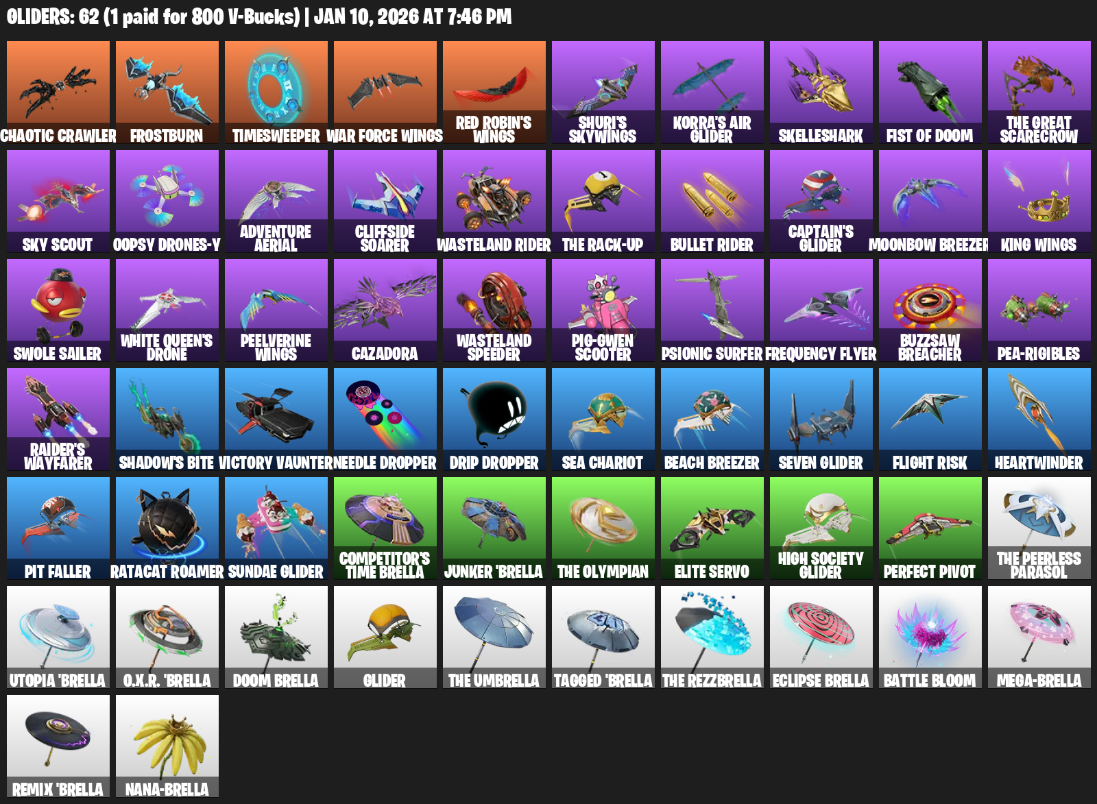 Chaotic Crawler, Frostburn, Timesweeper, Red Robin’s Wings, Shuri’s Skywings, Korra’s Air Glider, Skelleshark, Sky Scout, Oopsy Drones-y, Adventure Aerial, Cliffside Soarer, Wasteland Rider, Moonbow Breezer