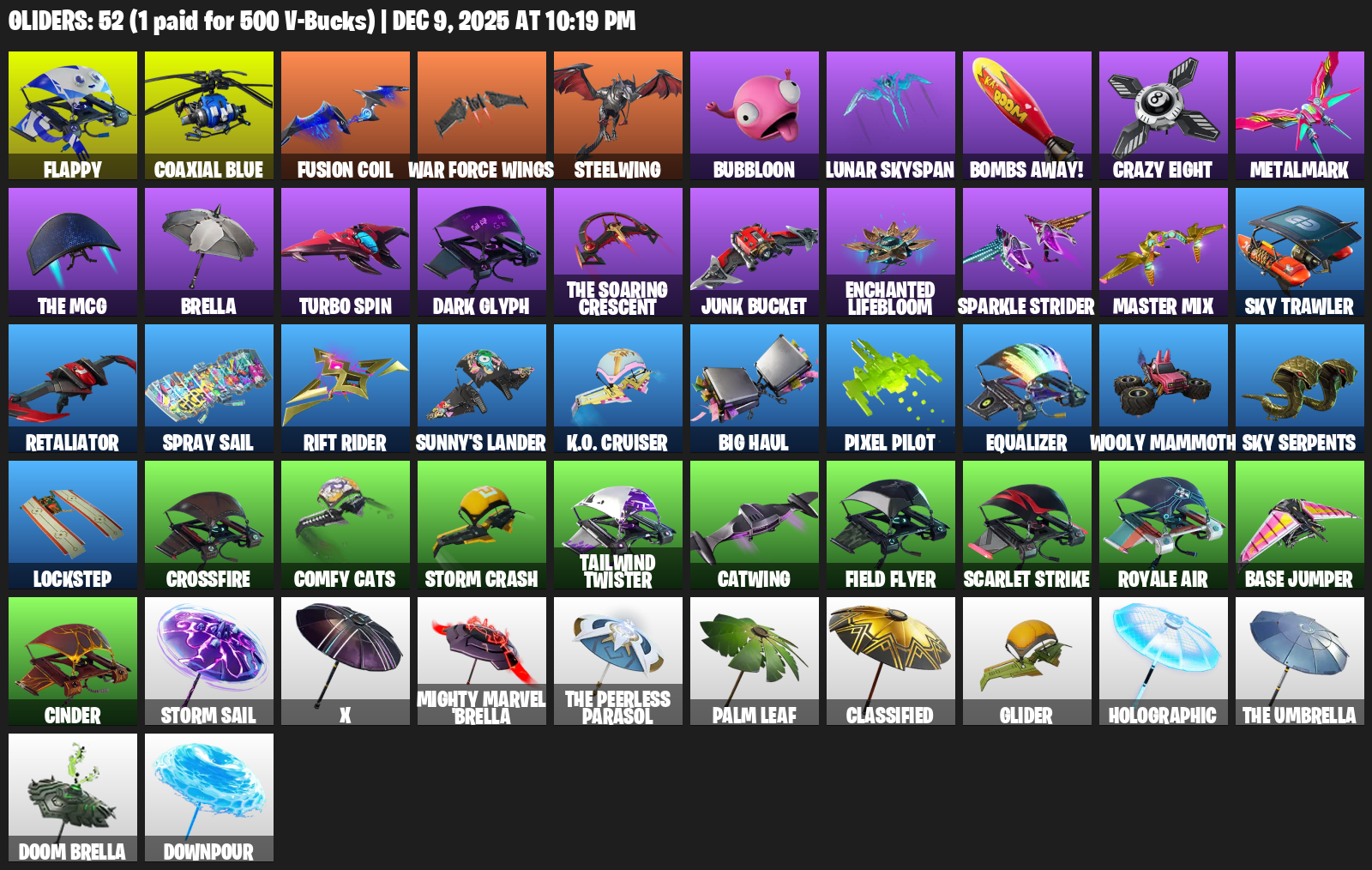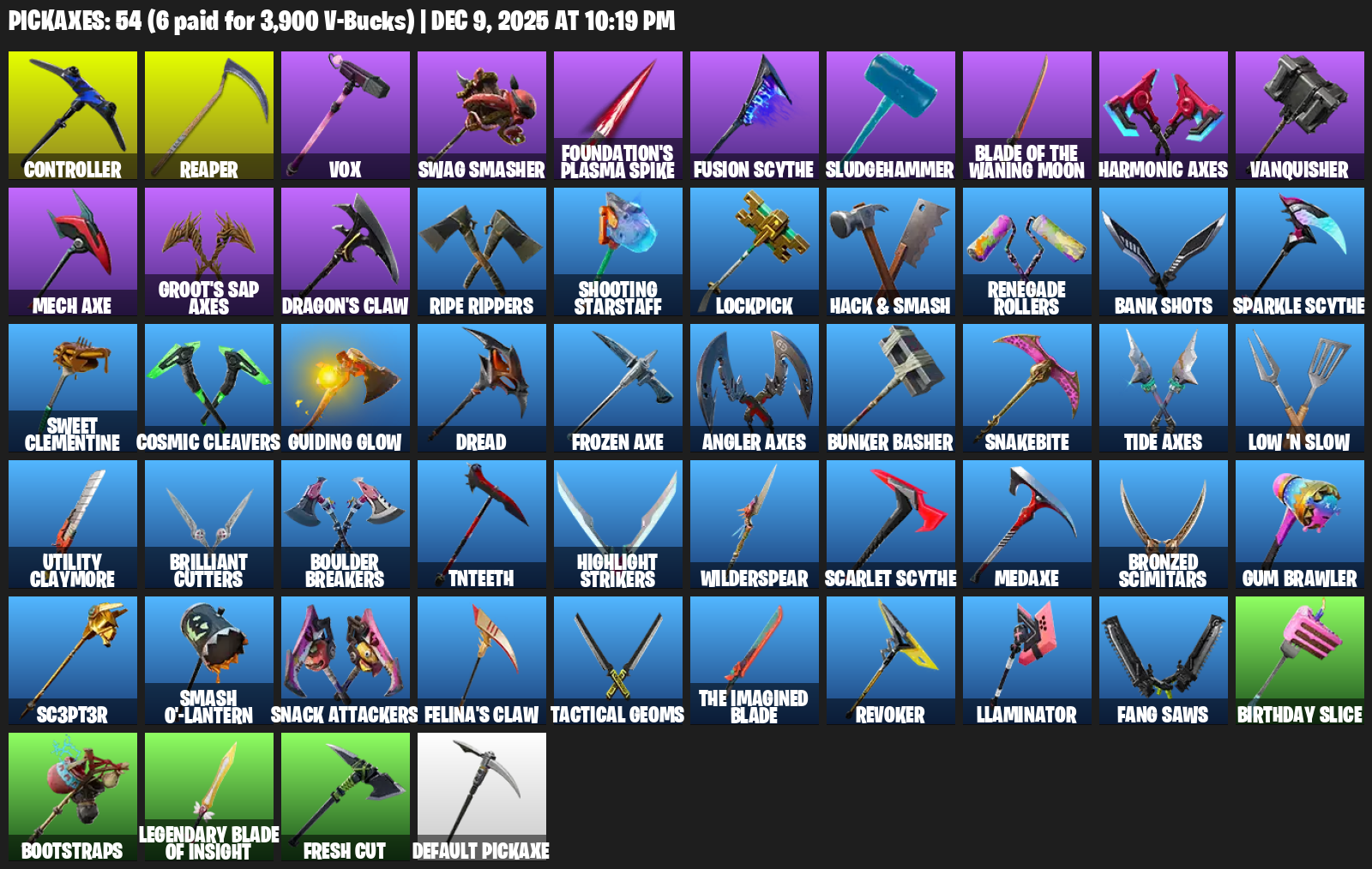 Controller, Reaper, Vox, Swag Smasher, Foundation’s Plasma Spike, Sludgehammer, Harmonic Axes, Vanquisher, Mech Axe, Dragon’s Claw, Ripe Rippers, Shooting Starstaff, Lockpick, Hack & Smash, Renegade Rollers, Bank Shots, Sparkle Scythe