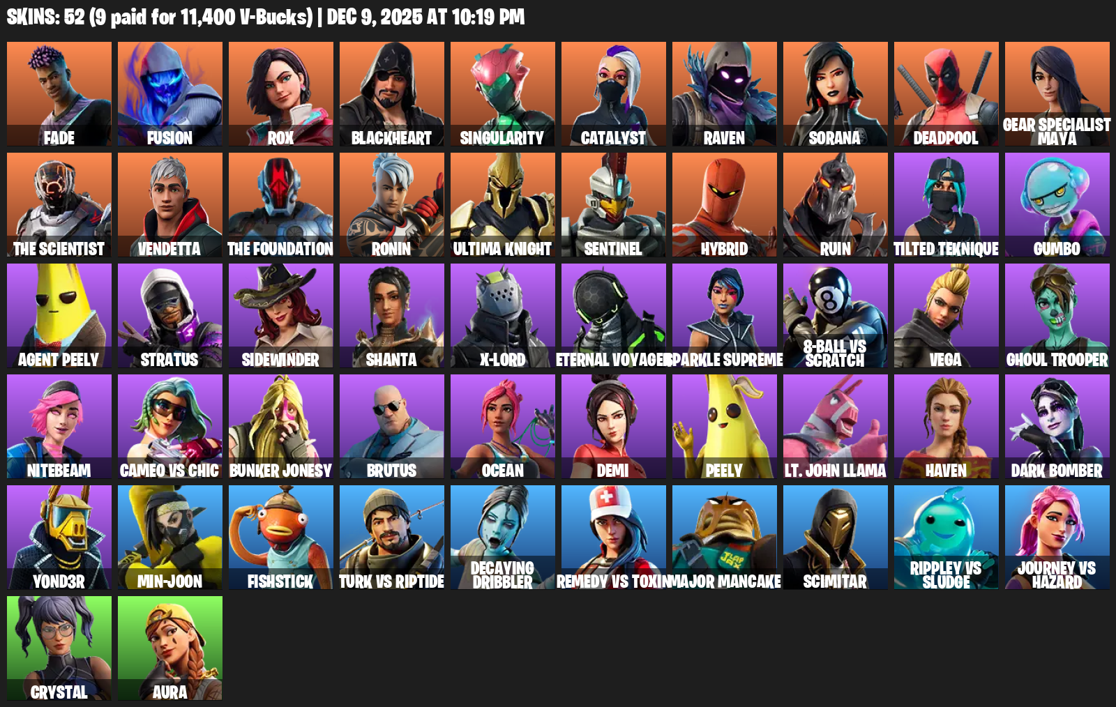 [PC/PSN/XBOX] | 52 skins | Reaper Axe | Fade | Fusion | Rox | Blackheart | Singularity | Catalyst | Raven | Sorana | Deadpool | #FZA1616