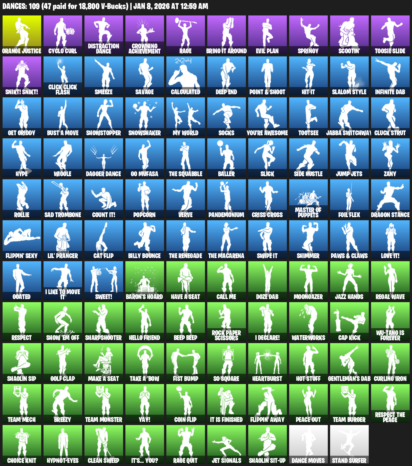 Orange Justice, Cyclo Curl, Distraction Dance, Crowning Achievement, Rage, Bring it around, Evil Plan, Springy, Scootin’, Toosie Slide, Snikt! Snikt!, Click Click Flash, Smeeze, Savage, Calculated, Deep End, Slalom Style, Infinite Dab