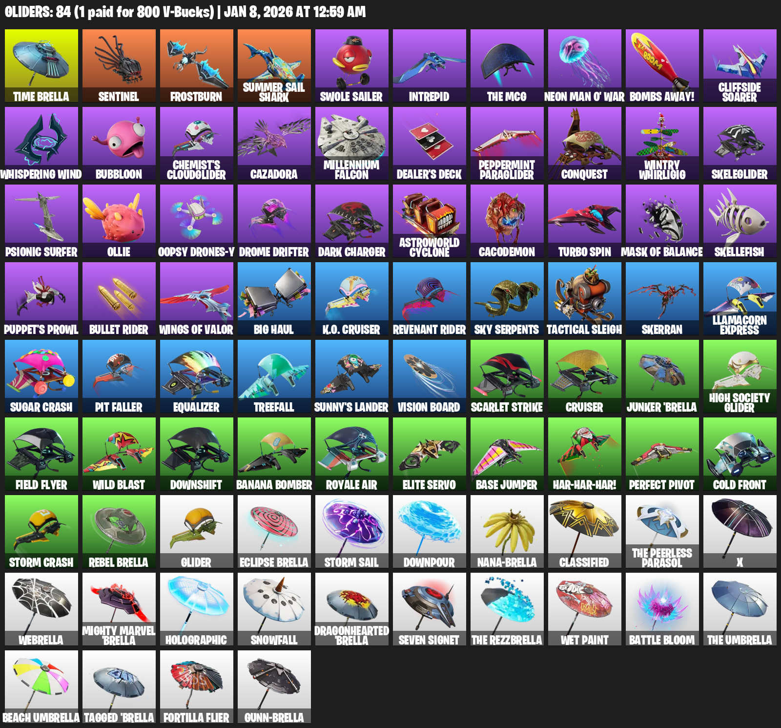 Time Brella, Frostburn, Summer Sail Shark, Swole Sailer, Intrepid, Neon Man O’ War, Bombs Away!, Cliffside Soarer, Whispering Wind, Bubbloon, Chemist’s Cloudglider, Cazadora, Millennium Falcon, Dealer’s Deck, Peppermint Paraglider, Conquest, Wintry Whirligig, Skeleglider