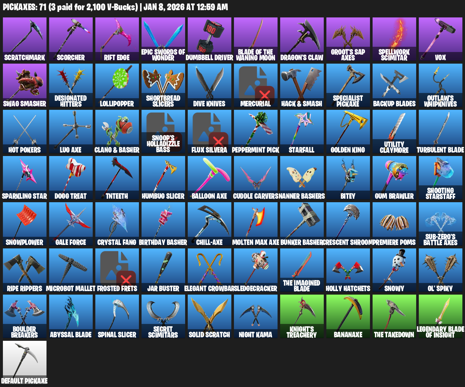 Scratchmark, Scorcher, Rift Edge, Dumbbell Driver, Blade of the Waning Moon, Dragon’s Claw, Groot’s Sap Axes, Spellwork Scimitar, Vox, Swag Smasher, Designated Hitters, Lollipopper, Shortbread Slicers, Dive Knives, Mercurial, Hack & Smash, Backup Blades, Outlaw’s Whipknives
