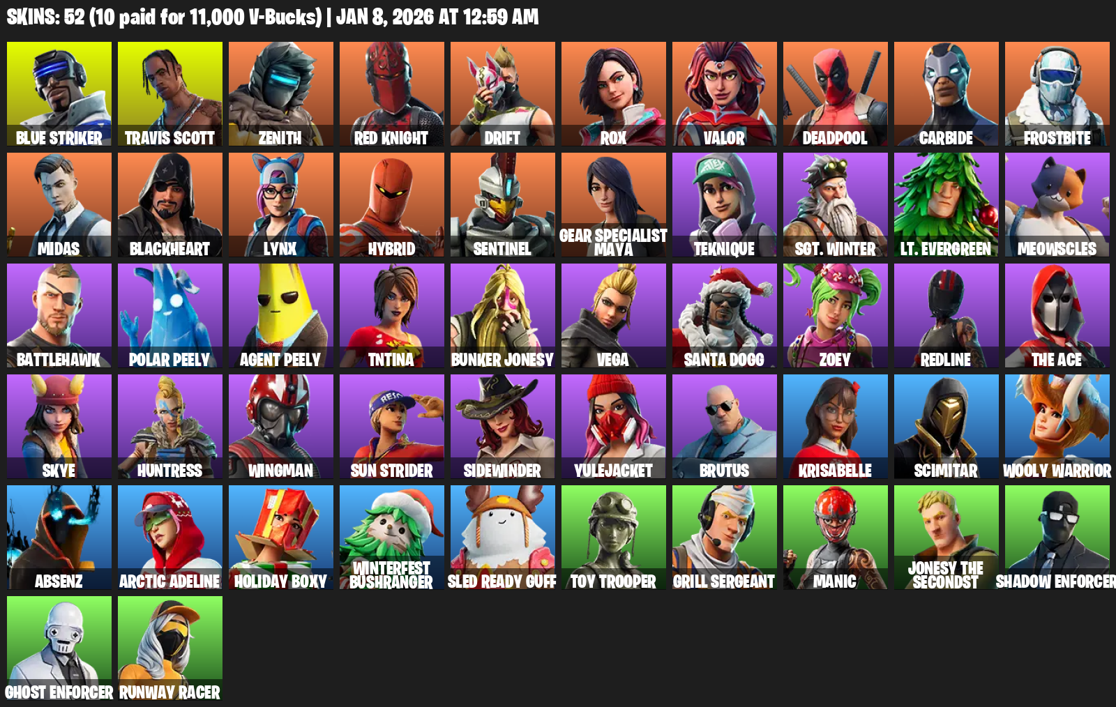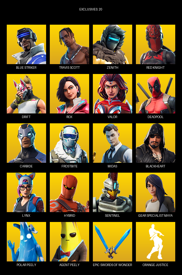 Travis Scott, Gear Specialist Maya, Blue Striker, Zenith, Red Knight, Drift, Rox, Valor, Deadpool, Carbide, Frostbite, Midas, Blackheart, Lynx, Hybrid, Sentinel, Teknique, Sgt. Winter, Lt. Evergreen, Meowscles