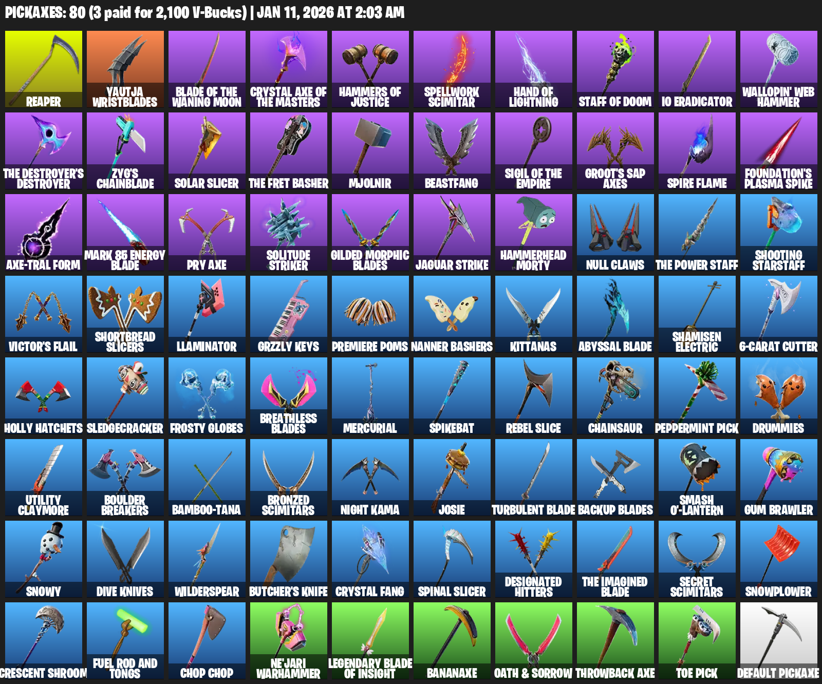 Reaper, Yautja Wristblades, Hammers of Justice, Spellwork Scimitar, IO Eradicator, Wallopin’ Web Hammer, Zyg’s Chainblade, Solar Slicer, Mjolnir, Beastfang, Groot’s Sap Axes, Foundation’s Plasma Spike
