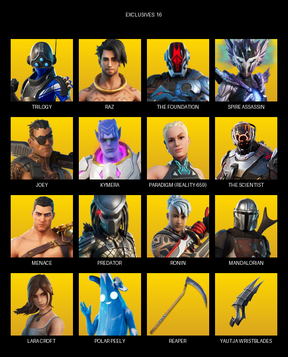Lara Croft, Trilogy, Raz, The Foundation, Spire Assassin, Joey, Kymera, Paradigm (Reality-659), Menace, Predator, Ronin, Mandalorian, Haven, Reese, Zyg, Groot, Mystique, Shanta, Guggimon