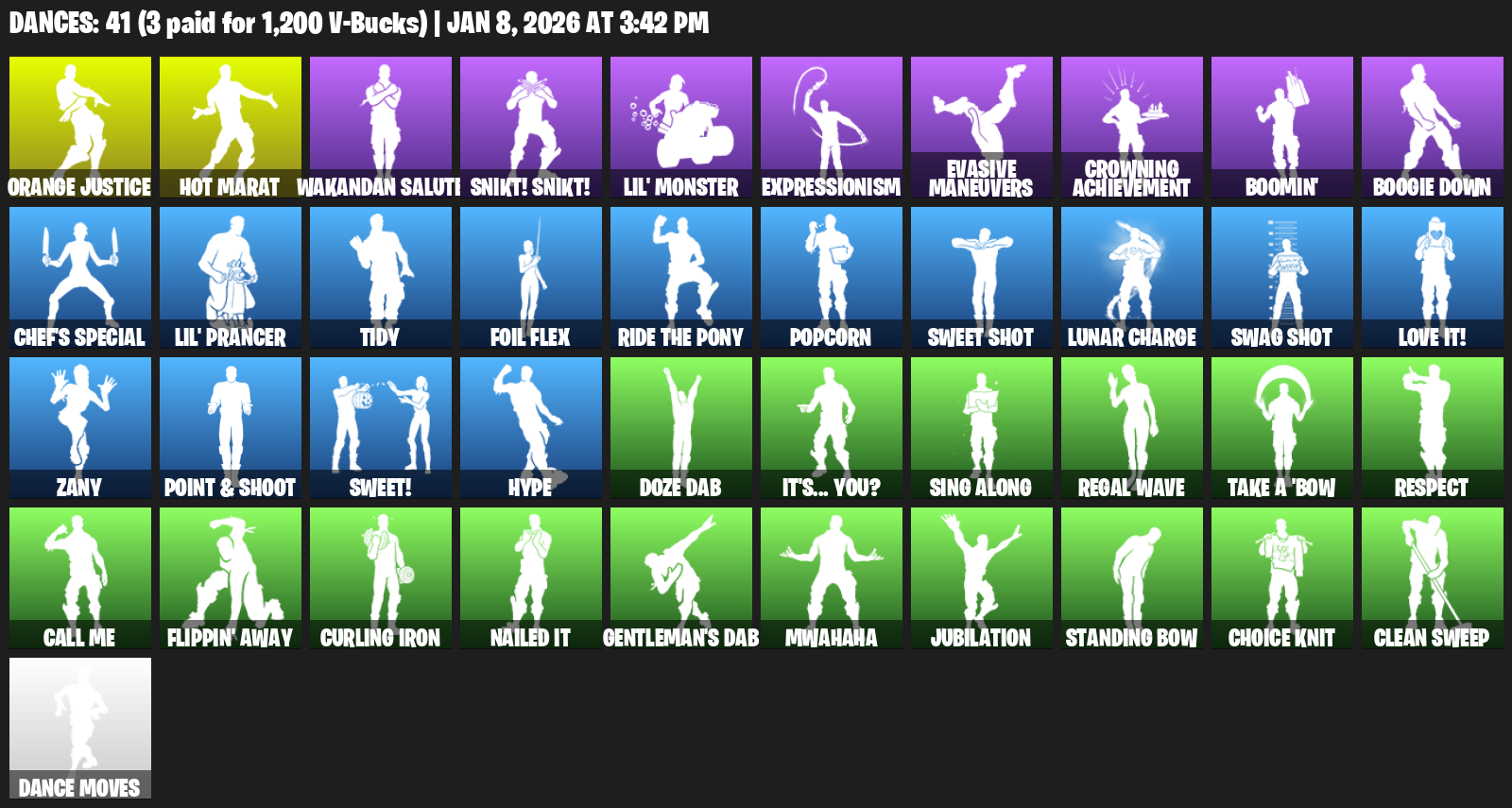 Hot Marat, Orange Justice, Wakandan Salute, Snikt! Snikt!, Lil’ Monster, Expressionism, Evasive Maneuvers, Crowning Achievement, Boomin’, Boogie Down, Chef’s Special, Tidy, Foil Flex, Popcorn, Sweet Shot, Lunar Charge, Love it!